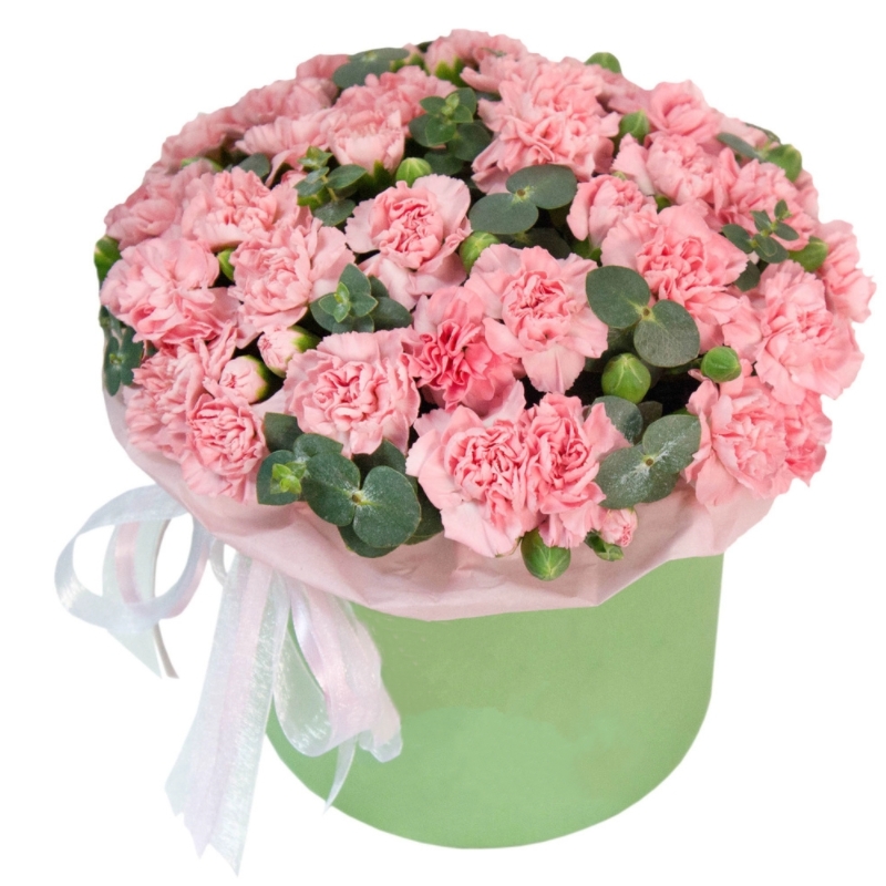 Букет состоит из 15 веток кустовых гвоздик, эвкалипт, коробка, оазис.