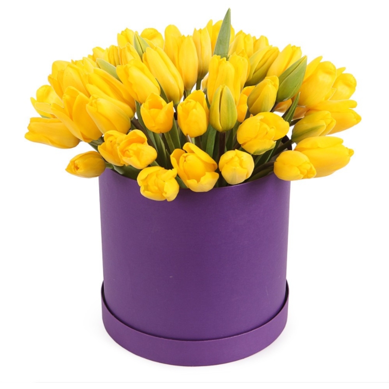 Букет состоит из 45 желтых тюльпанов, коробка, оазис.