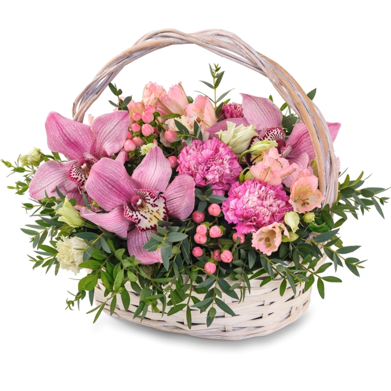 Букет состоит из 3 орхидеи, 3 гвоздики, 3 ветки эустомы, 3 альстромерии, 3 гиперикума, зелень, корзина, оазис.